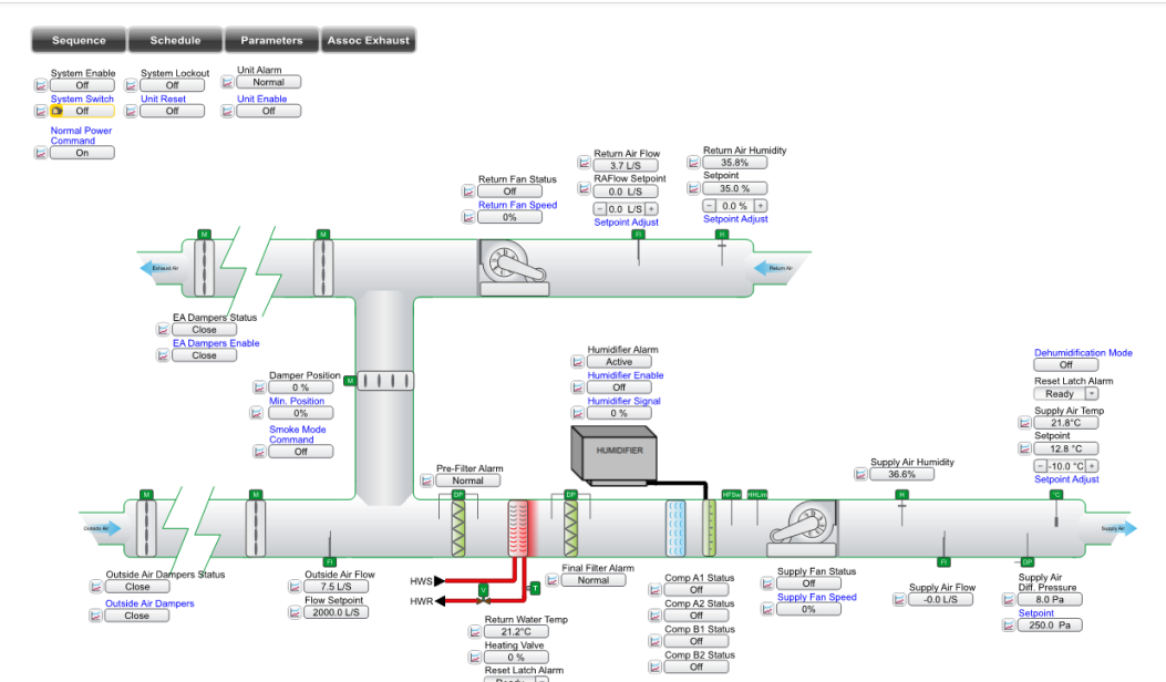 BAS overview of all zones from operator workstation - Reviewing alarms, and going over manual overrides